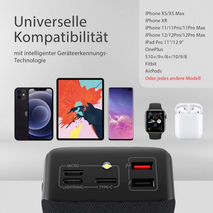 Die Powerbank verfügt über mehrere Anschlüsse, sodass mehrere Geräte gleichzeitig geladen werden können.