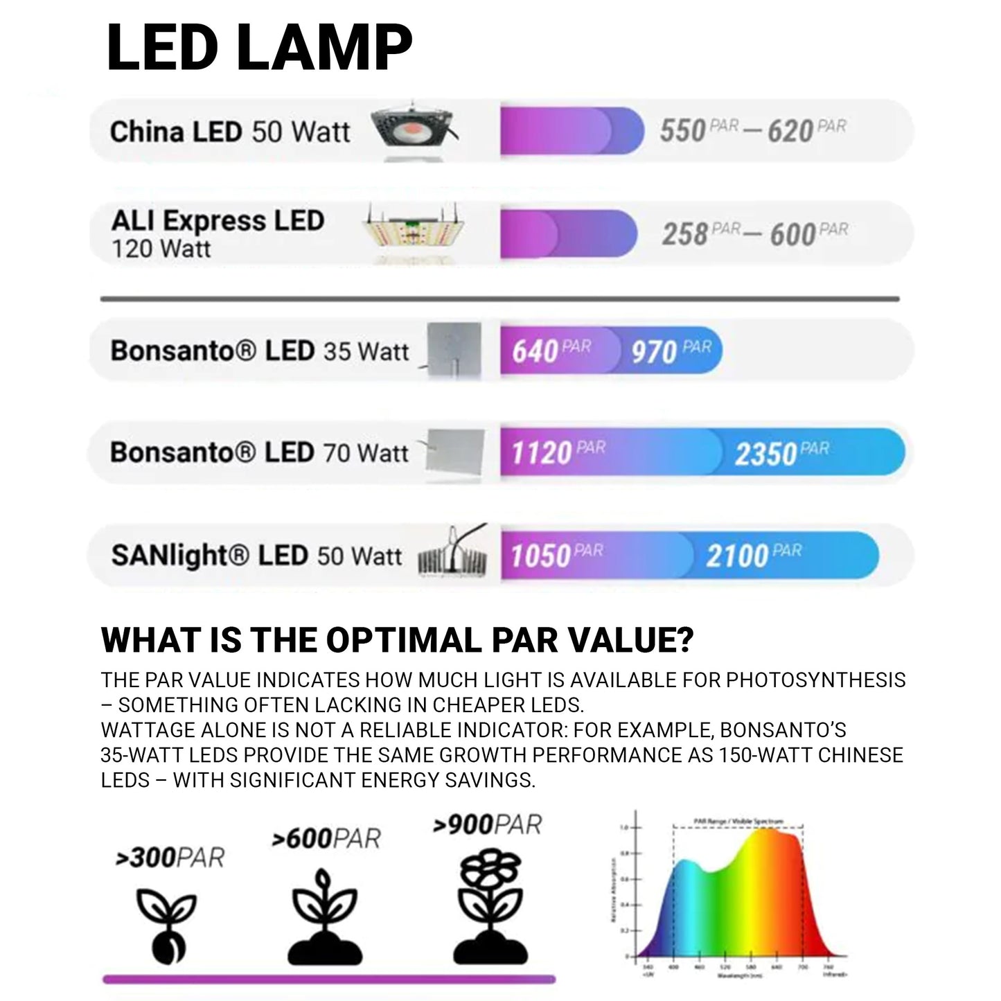 Die mitgelieferte 70-W-Vollspektrum-LED sorgt für ein natürliches Lichtspektrum in allen Wachstumsphasen – von der Keimung bis zur Blüte.