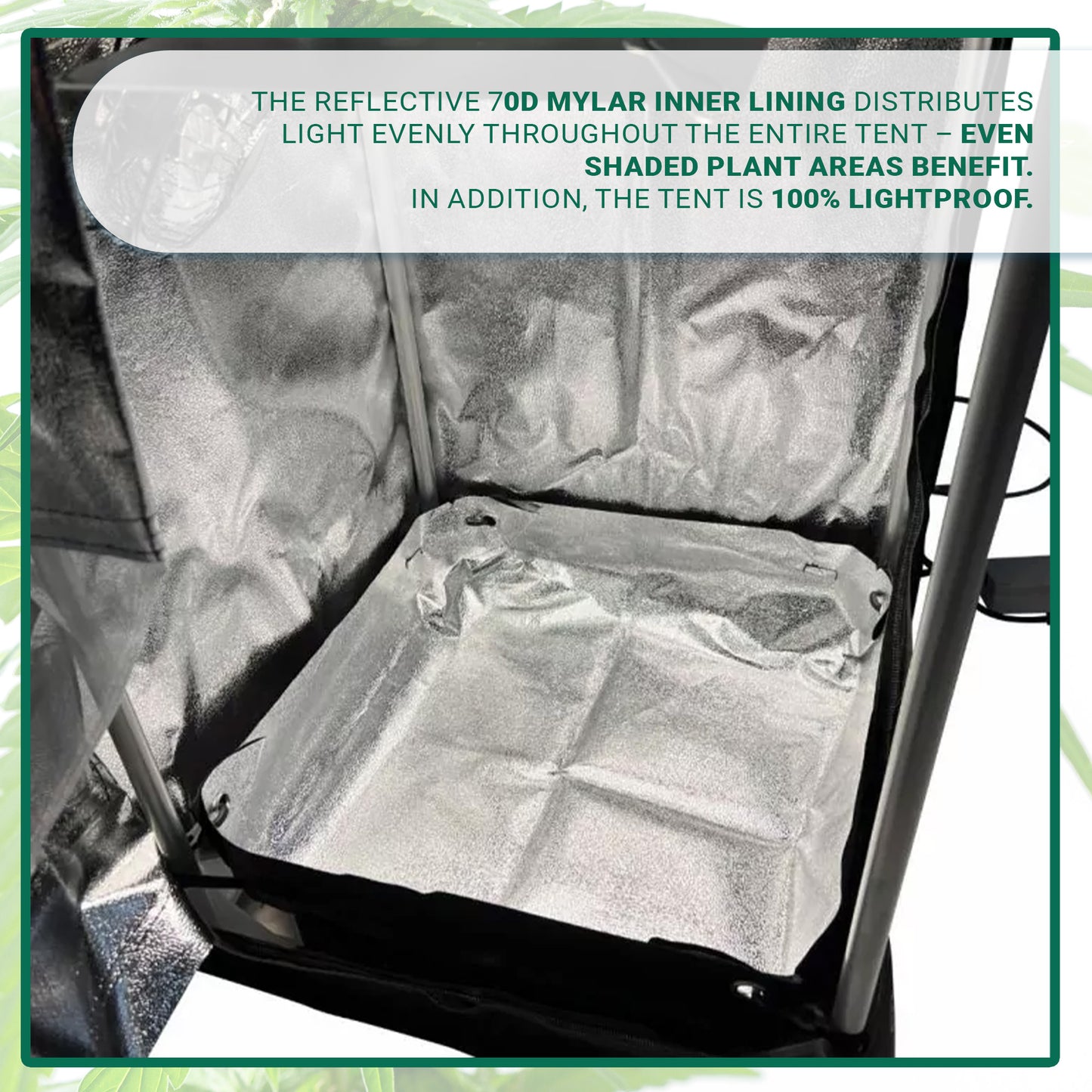 Die Mylar-Innenbeschichtung (70 D) reflektiert das Licht optimal, während das Zelt selbst 100 % lichtdicht ist.