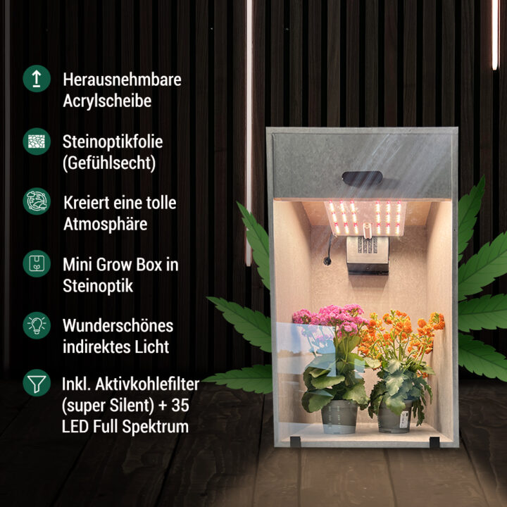 Mit ihrer exklusiven Steinoptik, der indirekten Beleuchtung und der hochwertigen Ausstattung bietet sie nicht nur ideale Wachstumsbedingungen, sondern wird auch zum echten Blickfang in jedem Wohnzimmer.