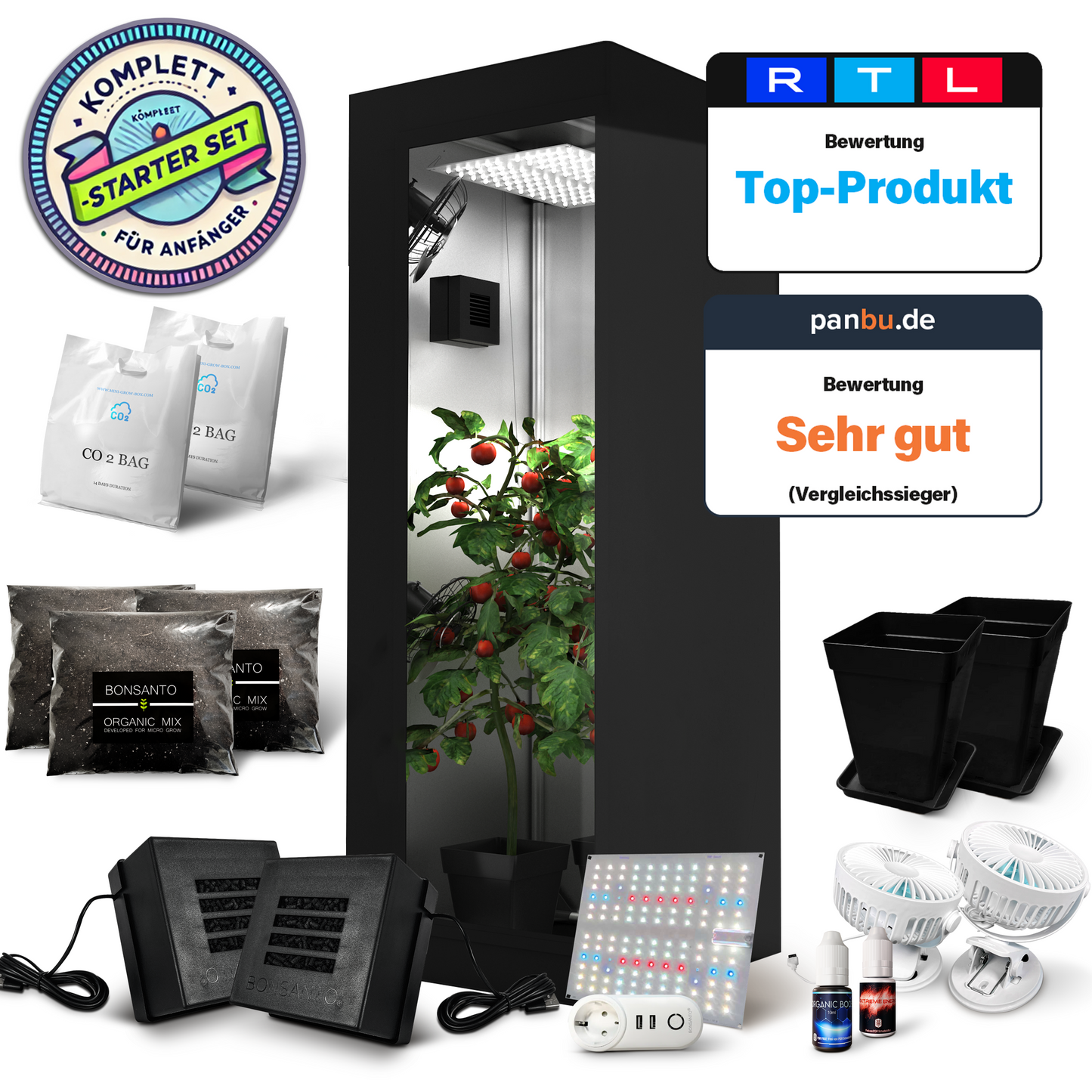 Legen Sie die Bonsanto CO2-Beutel zwischen der dritten und vierten Woche in die Box. Das Wachstum Ihrer Pflanzen wird durch die zusätzliche CO2-Zugabe beschleunigt. Füllen Sie den CO2-Beutel vor dem Aufhängen zu 1/3 mit Wasser. Wichtig: Das Wasser muss beim Einfüllen lauwarm (aber nicht heiß!) sein, damit die enthaltenen Stoffe miteinander reagieren können. Zusätzlich sollten Sie den Beutel etwas durchkneten (ca. 30 Sekunden), damit sich der Inhalt gut mit dem Wasser vermischt. Hängen Sie den CO2-Beutel anschließend einfach an den Schrankhaken (markiert). Der CO2-Beutel kann ab diesem Zeitpunkt während der gesamten Anzuchtphase verwendet werden. Er muss alle 14 Tage ausgetauscht werden. Füllen Sie die Töpfe bitte nach und nach mit frischer Blumenerde auf, da diese ebenfalls wichtige pH-regulierende Eigenschaften hat.