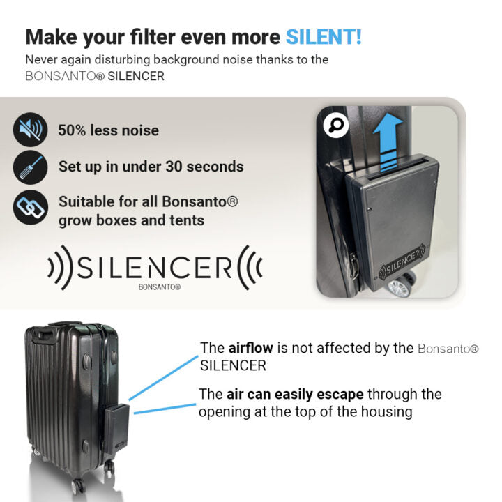 Der Bonsanto® SILENCER ist vollständig kompatibel mit allen Bonsanto® Boxen, -Schränken und -Zelten, insbesondere mit dem MAX Aktivkohlefilter.